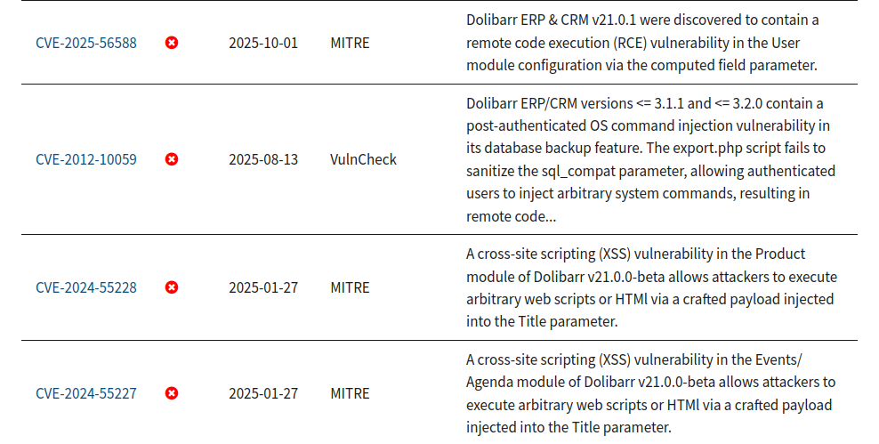 Dolibarr has had XSS vulnerabilities (letting attackers inject malicious scripts into web pages), as well as more serious issues such as SQL injection vulnerabilities (which can expose or modify information stored in the database) and remote code execution (RCE), where attackers can run their own code on the server. In short, the software has lots of great modules and tools, but like any other solution, if it is left unpatched or misconfigured it can become a security risk.