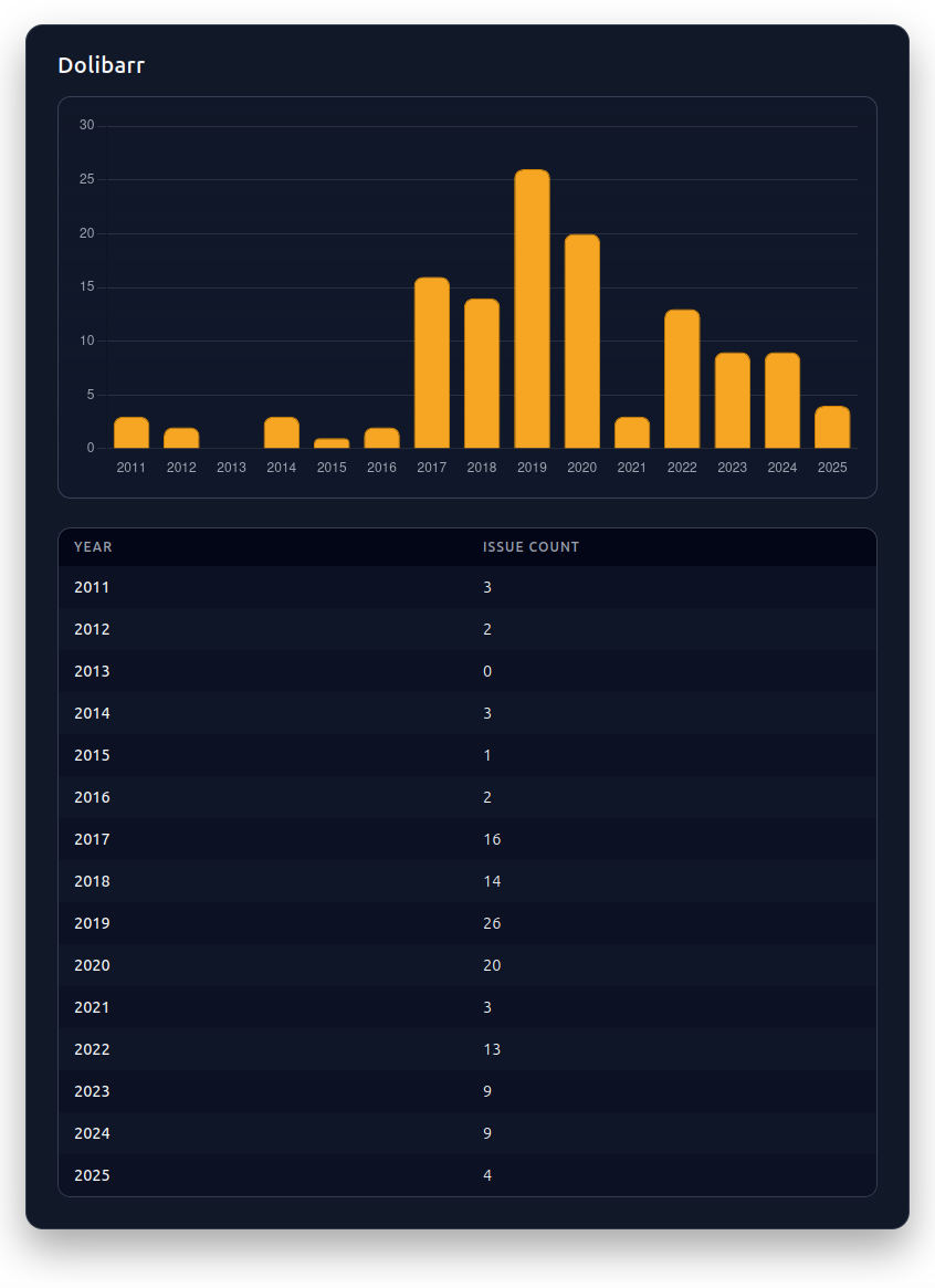 As the oldest platform reviewed, Dolibarr has one of the highest numbers of reported vulnerabilities among open-source CRMs. About half of these (63) were rated as high or critical severity.