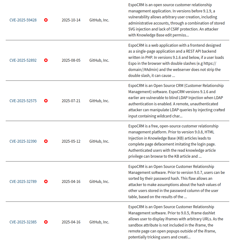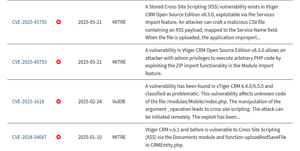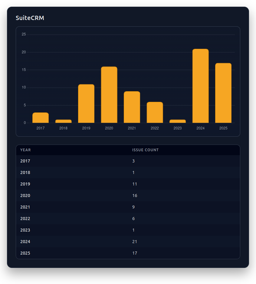Vtiger has been around for nearly two decades. As one of the oldest open-source CRMs, it has a substantial number of reported issues. Although many of them date back to the software’s early years, the solution continued to face regular security discoveries across nearly every year of development with only brief periods of visible stability.
