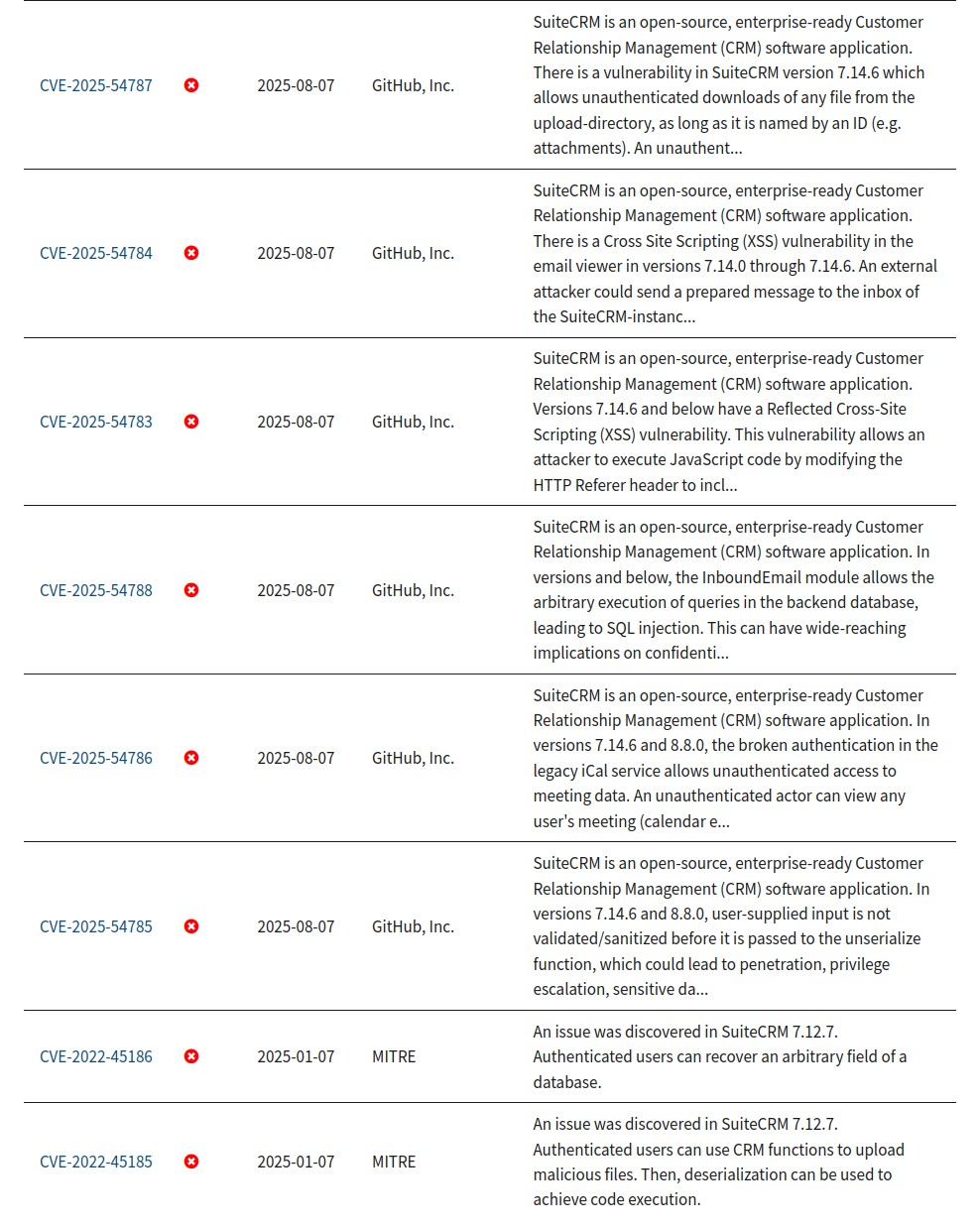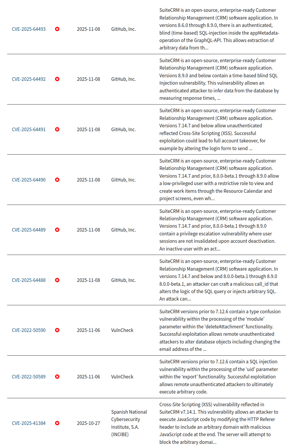 Disclaimer: This analysis ranks selected open-source CRMs using publicly reported CVEs from the National Vulnerability Database as of November 12, 2025. Vulnerability counts and CVSS scores change over time and may be incomplete or version-specific. The presence of more CVEs does not necessarily mean a product is less secure. No warranty is given, use this information at your own risk. Consult vendor advisories and a qualified security professional before making decisions. Product names are trademarks of their respective owners.