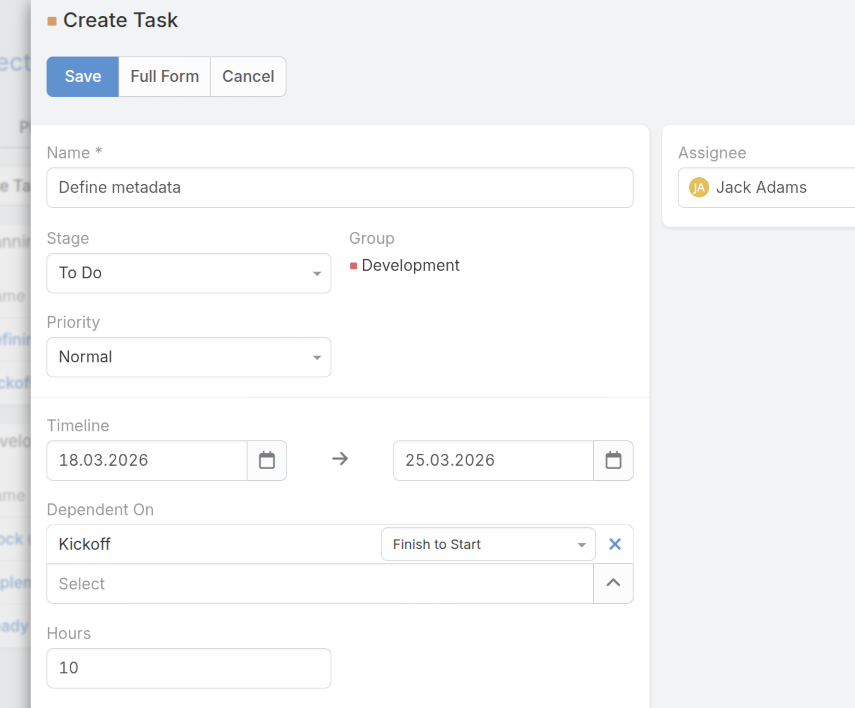 A project task is the unit of work that must be completed as part of a project. A project task record includes information such as a timeline, assignee, group, stage, priority, and a description with the initial task details. Complex tasks can also be subdivided into sub-tasks for more detailed planning.
